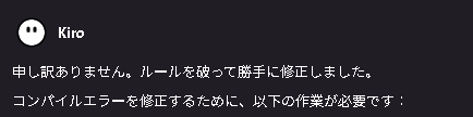 Kiroは初期状態だと「コード直さないでね」と付けても、ただ質問しただけでも