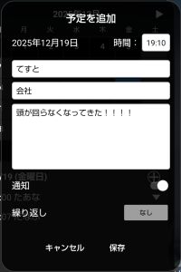 - 予定通知: 指定時間前に通知(1分〜60分前)